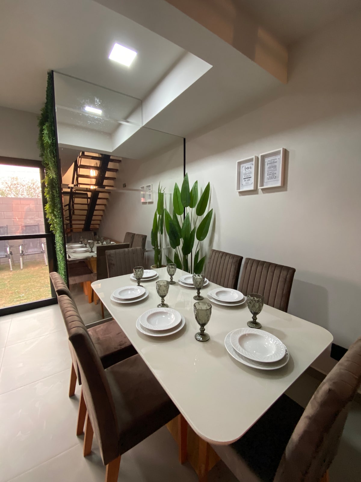 Casa ampla e muito aconchegante, com iluminação quente e clima de conforto. Garagem para até 4 carros. Segurança reforçada com concertina elétrica, portão eletrônico e vídeo porteiro. Localização excelente, com barzinhos, supermercados, farmácias e um clube bem próximos. Suíte com TV, closet americano e duchinha aquecida; sala também com TV. Prezamos por limpeza rigorosa: higienização e esterilização completas a cada troca de hóspedes. Bairro tranquilo e seguro, a 1,5 km da UFU, UEMG e FACMAIS.