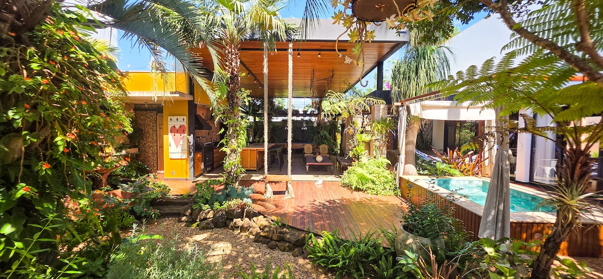 Uma casa dentro de um jardim. No Recanto do Algodão, um refúgio farmhouse em 600 m² de área verde, o tempo desacelera naturalmente. Ao atravessar o portão, a cidade fica do lado de fora e surgem caminhos entre plantas, árvores e espaços de convivência. O espaço conta com cozinha gourmet, gazebo no jardim, balanço, mesa de bilhar e spa aquecido com hidromassagem, além de horta de ervas e árvores frutíferas. Um lugar pensado para reunir pessoas, descansar e aproveitar a natureza.