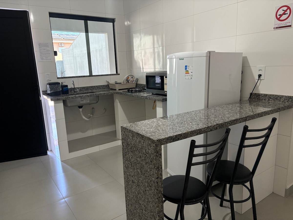 Relaxe neste lugar único e tranquilo. Bem-vindo(a) à nossa casa de hóspedes, ideal para quem busca tranquilidade e praticidade. Com ambientes separados, decoração minimalista e um quintal com churrasqueira, o espaço é perfeito para relaxar ou curtir bons momentos. A casa é totalmente independente, garantindo privacidade durante toda a estadia. A garagem é compartilhada, coberta e gratuita. Somos pet friendly e aceitamos até 2 pets de pequeno porte.