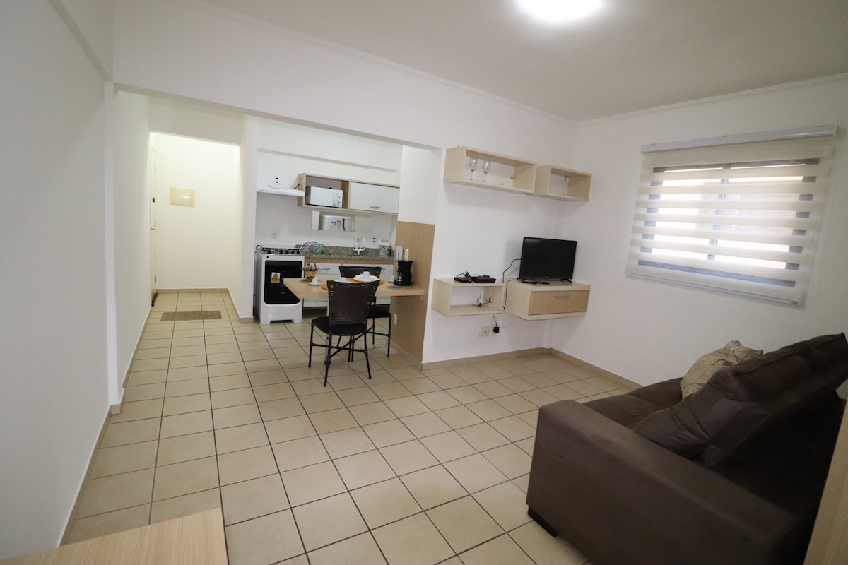 Com 33m2, o espaço possui quarto/sala/cozinha integrados com banheiro privativo. Possui varanda ampla com vista para os melhores restaurantes do condomínio. Acomoda 2 pessoas confortavelmente em cama casal com roupa de cama e banho completos para seu total conforto. Cozinha equipada para o preparo de refeições e aquele cafezinho coado imperdível. Sala com sofá-cama e ar condicionado. Espaço de trabalho e Smart TV. Você vai se divertir muito neste confortável lugar para ficar ;)