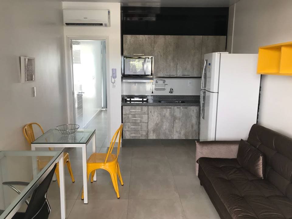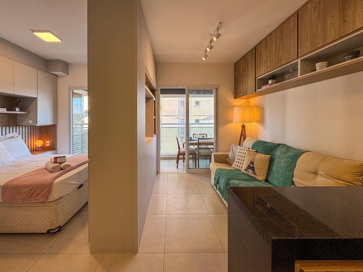Loft diferenciado e localizado em região privilegiada da cidade! Sacada gourmet fechada em vidro e climatizada, com mesa e cadeiras para você apreciar aquele churrasco! Quarto com cama queen size com divisória separando o ambiente da sala mantendo sua privacidade. Sala com sofá-cama que acomoda 1 pessoa, Smart TV, ar condicionado, mesa auxiliar e aparador. Cozinha completa para o preparo de suas refeições. Enxoval de cama e banho completos. Vaga de garagem dupla. Venha se hospedar! :)