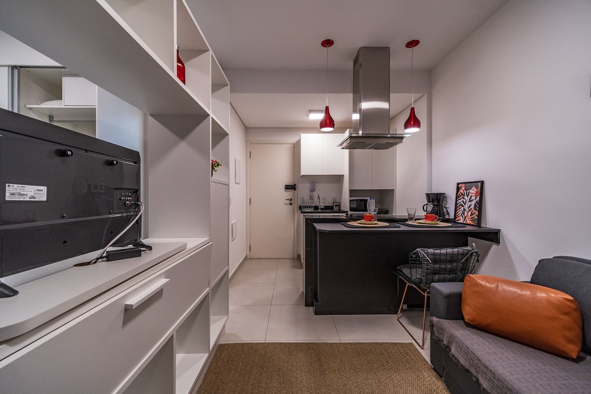Relaxe neste espaço calmo e cheio de estilo. Sacada, com espaço agradável para relaxar e tomar uma fresca. Quarto possui cama casal com a comodidade de guardar seus objetos no armários e assistir aquele belo filme. Sala com sofá com Smart TV e ar condicionado. Cozinha completa para o preparo de suas refeições. Enxoval de cama e banho completos. Vaga de garagem gratuita e coberta. Prédio com infra completa, tendo cafeteria, restaurantes e lojas com ótimos serviços. Gostou? Venha se hospedar ;)