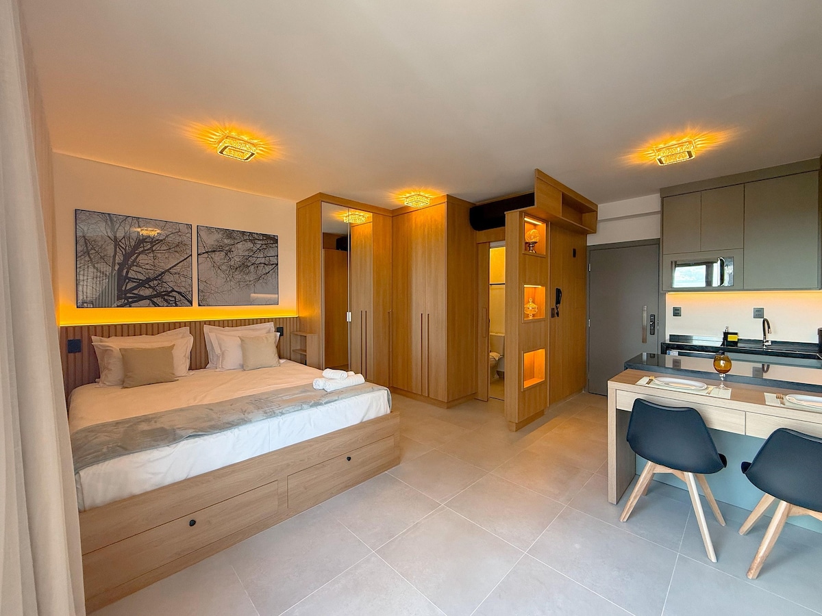 Studio Olive é completo e cheio de charme no 7º andar, com uma vista linda e ambiente acolhedor. A cama king é confortável com ar-condicionado e SmartTV que garante bem-estar. A cozinha está equipada com utensílios, liquidificador, airfryer, sanduicheira e cafeteira, porque aqui, cada detalhe importa. Ideal para até 2 hóspedes, o espaço oferece enxoval completo com toque de hotel boutique, pensado para quem valoriza conforto e praticidade.