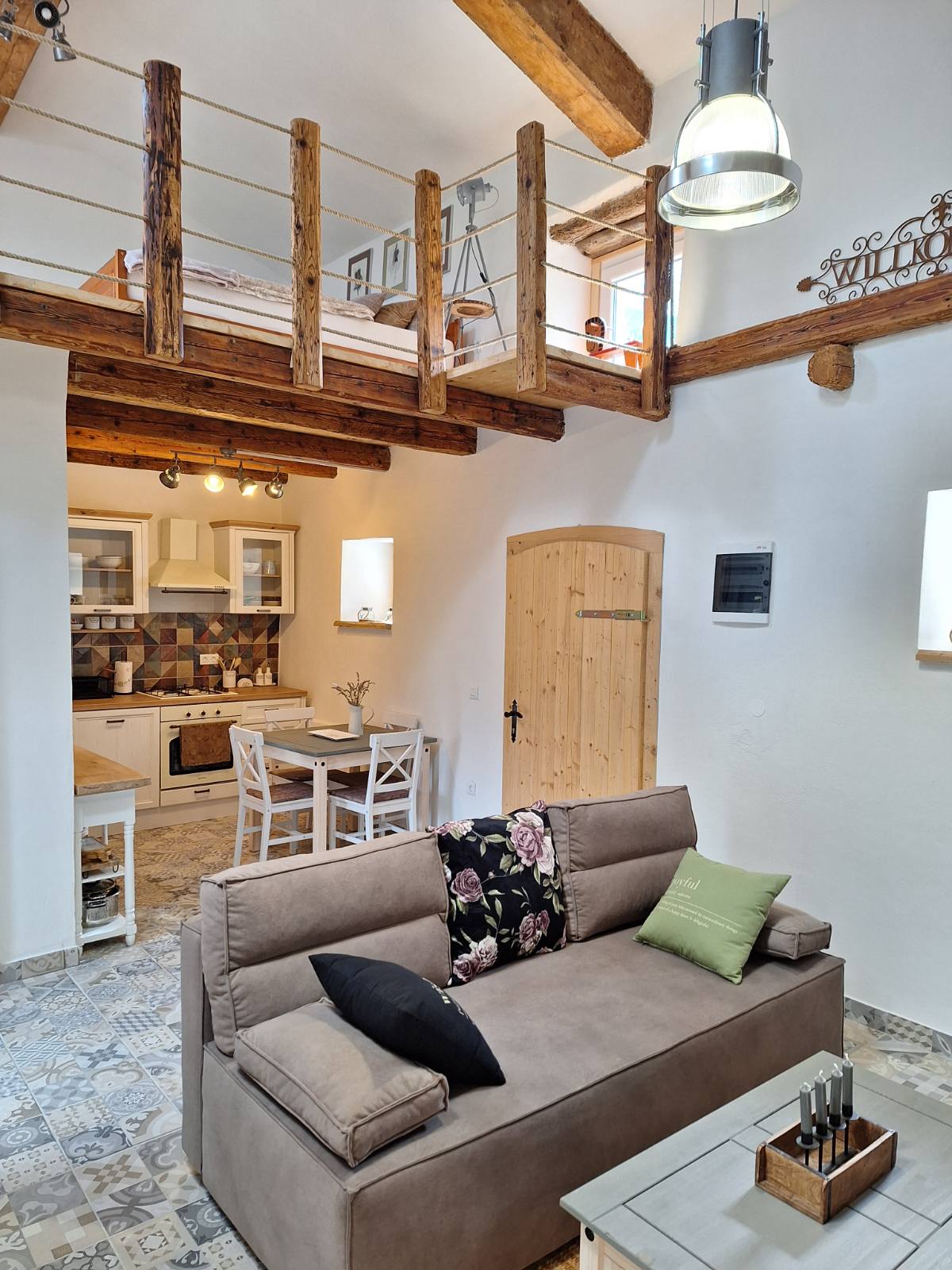 Kućica je prvenstveno bila namijenjena za uživanje obitelji u njoj i ugošćavanje prijatelja uz kamin,dobru hranu,vino i vatricu. Zato i ima veeeliki stol i klupe. Uredili smo ju po svom guštu, sav namještaj izrađen je od drva. Pri uređenju se nismo vodili time da sve mora biti usklađeno i da paše već time da nama bude lijepo,ugodno i funkcionalno. Kako smo s vremenom došli na ideju da bismo mogli iznajmljivati, nadamo se da će i svim gostima koji se zateknu u njoj biti isto tako lijepo i ugodno.