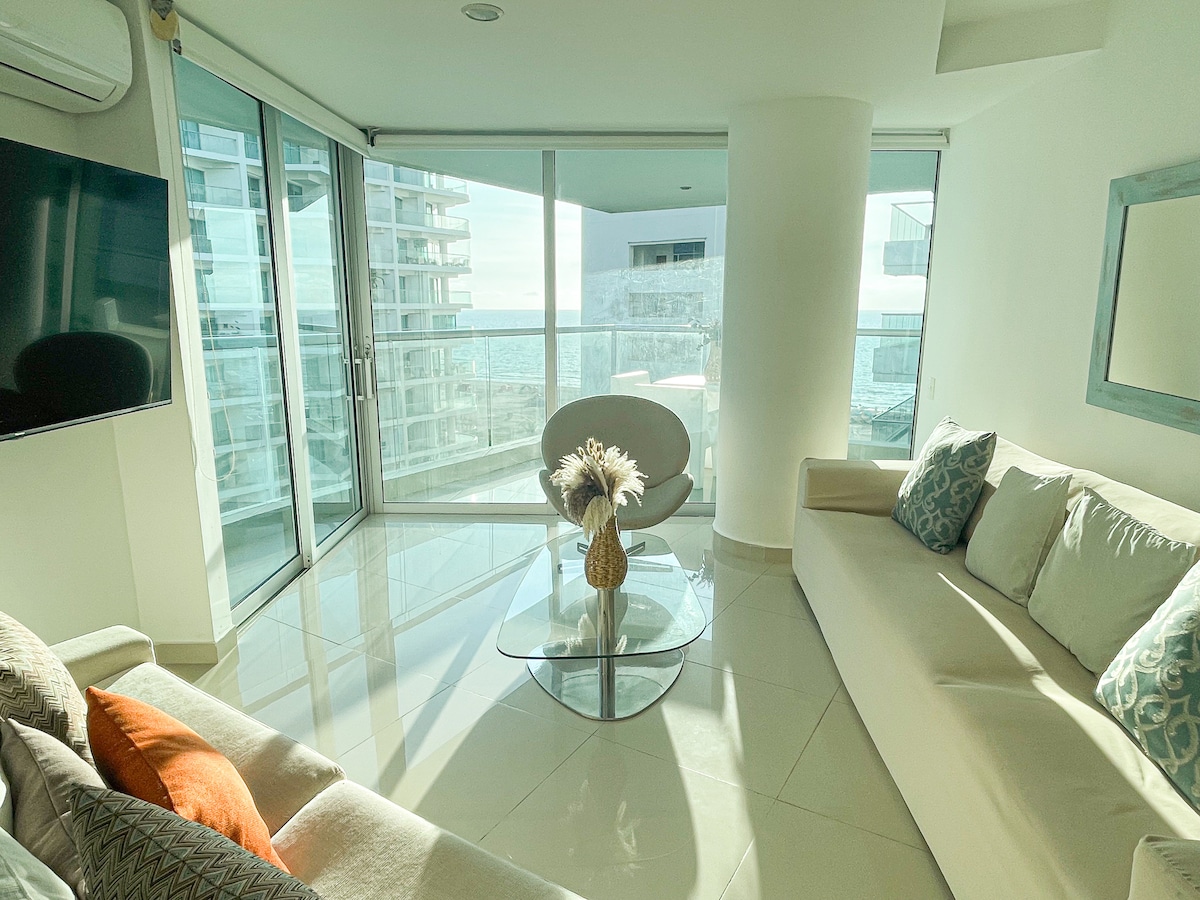 Hermoso apartasuite, con la mejor vista al mar que podrás imaginar, a solo unas cuadras del aeropuerto de Cartagena, totalmente equipado. Cuenta con una cama queen, un sofá cama doble, aire acondicionado, Smart TV y una impresionante terraza con área de comedor y vista al mar de Crespo. El apartasuite puede alojar hasta 4 personas, lo que lo hace ideal para parejas. Estamos ubicados en el barrio Crespo, a solo 8 minutos del Centro Histórico y cerca de playas como Marbella, Playa Azul y Morros.