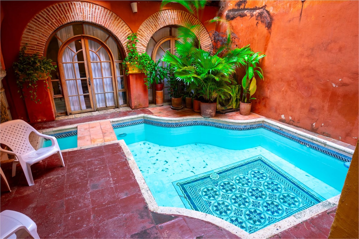 This stylish unique house is located in the Centro Historico of Cartagena, in the trendy neighbourhood of San Diego. It is a tasteful home for a romantic hideout. This property offers a refreshing private pool, a small rooftop terrace perfect for sunset cocktails, A/C where needed and the option to cater for 5 guests. Right next to great bars and restaurants, this stylish Historical Colombian home is filled with great details, high ceilings, wooden beams, antique bath, and quality amenities.
