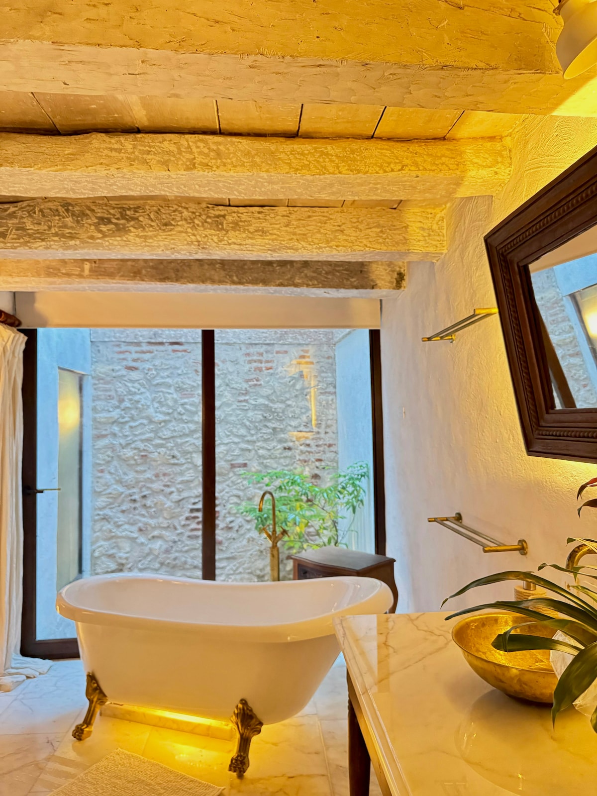 The Santo Domingo Square Loft – Luxury in a 17th Century Mansion Welcome to The Santo Domingo Square Loft, a beautifully renovated gem located just 20 steps from the most iconic square in Cartagena. This stunning loft is nestled inside a 17th-century mansion, offering a unique blend of historic charm and modern luxury. With its marble floors, spacious design, and a classic bathtub, it’s the perfect place to relax and immerse yourself in the rich culture of the Old City.