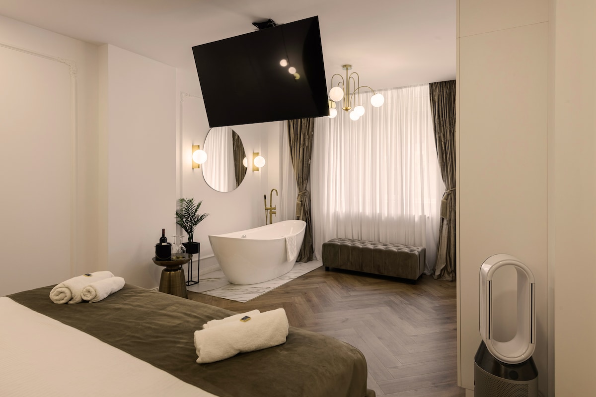 This 50 sqm apartment blends refined modern design with elegant details and a soothing atmosphere. The Royal Master Bedroom features a luxurious king-size bed (200x200 cm), a freestanding bathtub, and a rotating TV viewable from both the bed and the bath — perfect for intimate moments of relaxation. Soft lighting, fine textures, and a spacious wardrobe complete the sophisticated charm of this romantic hideaway, where comfort meets elegance in every detail, creating an unforgettable stay.