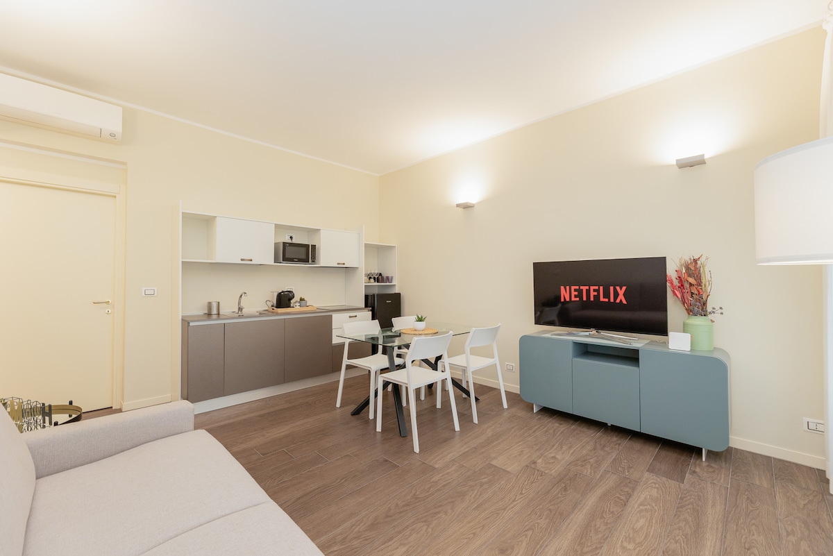 Soggiorna nel cuore della città in un elegante appartamento con grandi spazi arredati all’insegna della comodità e del relax .Il salone luminoso , diviso in tre aree , é separato dalla parte notte mediante una vetrina ornamentale contenente una collezione di porcellane antiche.Le diverse zone giorno si dividono in relax tv , ampia sala da pranzo e cucina attrezzata: qui trovano posto due divani letto. Una delle due camere matrimoniali può trasformarsi anche in camera a 3 letti singoli.