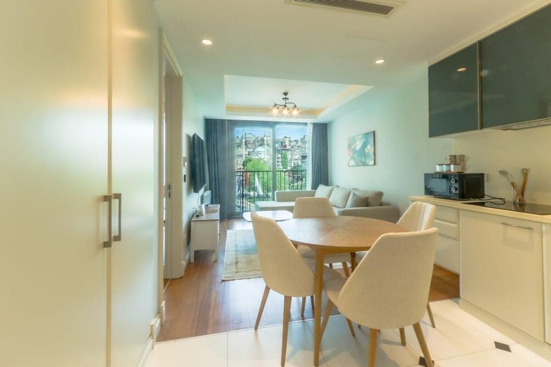 This extraordinary, stylish, spotless suite has a comfy sofa for rest, a high-quality bathroom, and an elevator in the great location in the Beyoğlu/Taksim district. Moreover, enjoy the magnificent panoramic view of Bosphorus (till Prince' Islands and Asian side) and Historical Peninsula (Topkapi Palace, Hagia Sophia, Süleymaniye Mosque, Galata Tower, along with other famous monuments) from its large private terrace with a big table.