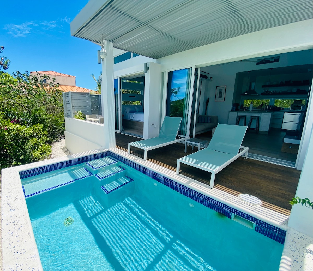 Luxurious Gated Villa near Grace Bay Beach– Private Pool & Jacuzzi♨️ Escape to this luxury villa, just 2 minutes by car or a 10-min walk from Grace Bay Beach. Relax in your private infinity pool or rooftop jacuzzi with ocean view. The villa features 2 outdoor balconies, a modern kitchen with new appliances, and fast fiber internet. Perfect for 2 guests, this private retreat offers comfort, style, and Super host service. Close to dining, shopping, and activities. Book your dream vacation today🌴