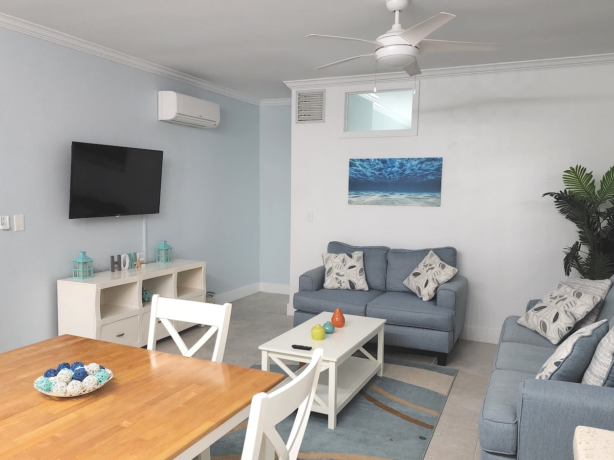 Our Sail Loft home features two separate but identical efficiency suites, each one equipped with a King Sized bed. This side of the duplex is called Sail Loft Starboard. The pool is shared with guests who may be staying in the other side. Wander down to the dock and use our SUPs and kayaks in the canal where you are guaranteed to see turtles. Fast WiFi lets you work from home if you must. Smart TVs with Netflix help you wind down after a day of fun.
