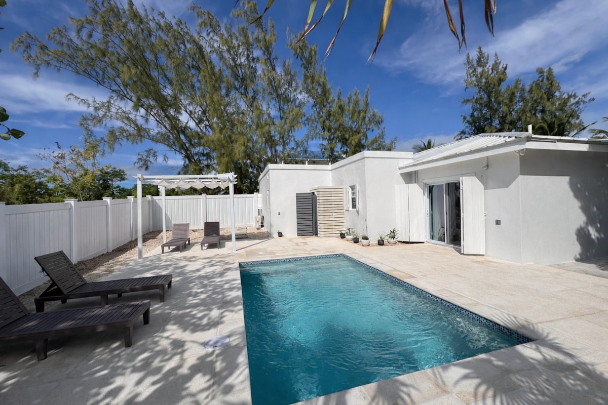 A modern beach villa with its own private pool. Sleeps up to 4 adults in separate rooms. Just 250 steps from the azure blue waters and soft white corals sands of Grace Bay beach. In a quiet off-street location. Perfect for a romantic getaway. With its quiet secluded garden and pool area, many of our guests come to celebrate birthdays, anniversaries, and honeymoons in full privacy. Walk to coral reef snorkeling in 3 mins plus several restaurants. Large grocery supermarket & shops are nearby.