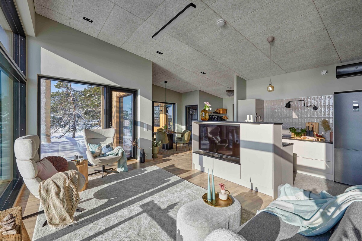 Perched high on a rock overlooking the sea, Villa Naantali Frame is a modern vacation retreat, where you find yourself amidst the most beautiful archipelago by the sea, embraced by the rock and twisted pine trees. Here, you can indulge in nature's tranquility, observe passing boats, and take refreshing swims in the sea, even in winter. The living room's frame offers a stunning view of the sea and forest, creating a picturesque backdrop.