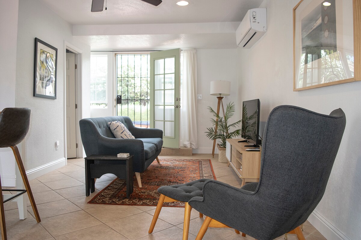 The Studio is a warm, more modern styled cottage, safely nestled in the backyard of a home, as a detached structure with a private entrance, front porch & plant life. Located in a quiet, tree lined residential neighborhood. It’s fully furnished, loaded with amenities...from appliances, kitchenware and condiments to personal care items. Comfortably hosts 1-2 adults, featuring a queen size bed with memory foam mattress.