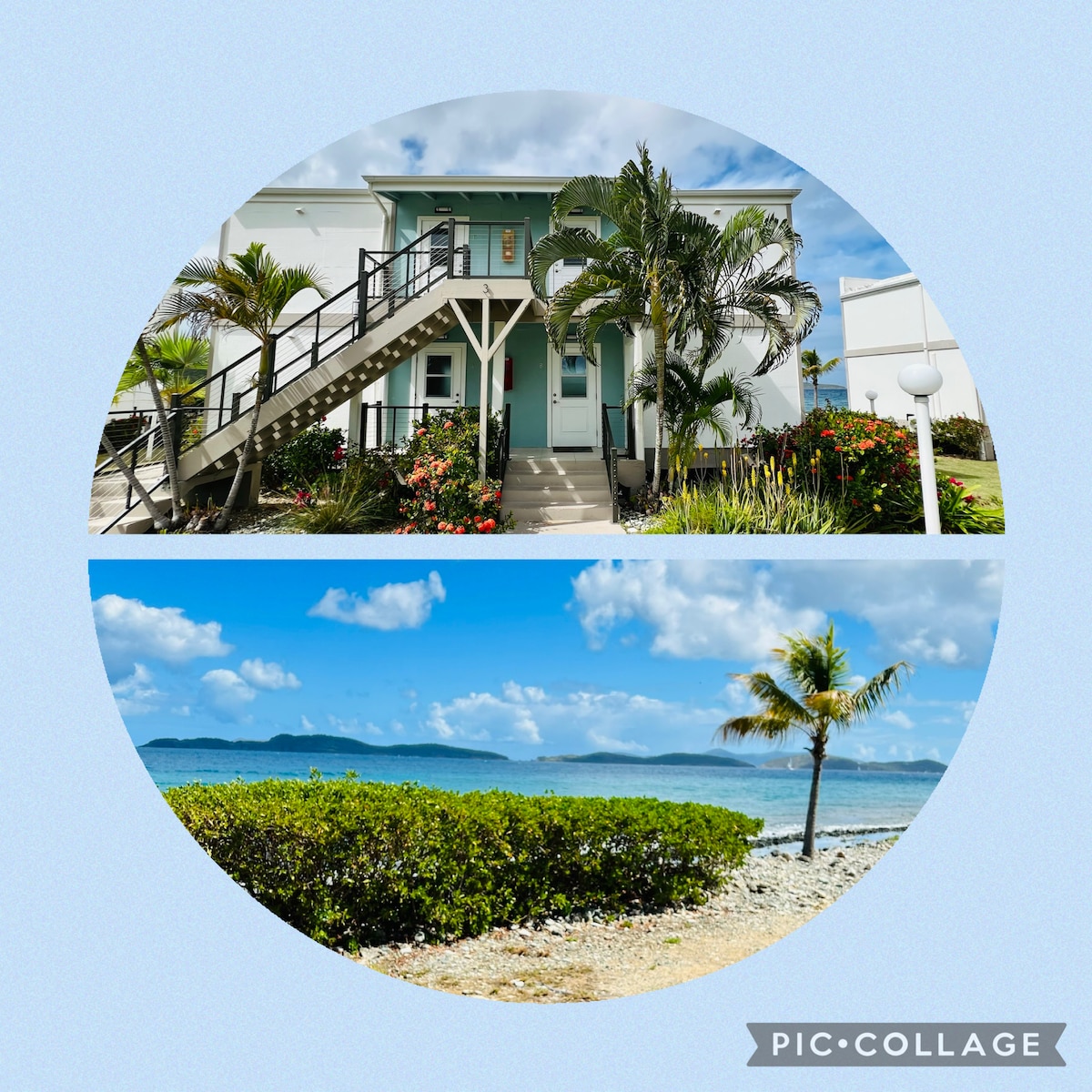 Two story oceanfront VILLA with PRIME views of the marina and St. John at SAPPHIRE BEACH RESORT. This 1200 square ft. newly furnished, two story villa sleeps 6. It offers robes, outdoor couch and dining, grill, cable, upstairs and downstairs TV, two bathrooms, washer, dishwasher, and wifi. Relax in the large upstairs bedroom with cathedral wood planked ceilings and plush KING SIZE BED or enjoy lounging outside at one of TWO BALCONIES that offer the best views at Sapphire Beach Resort!