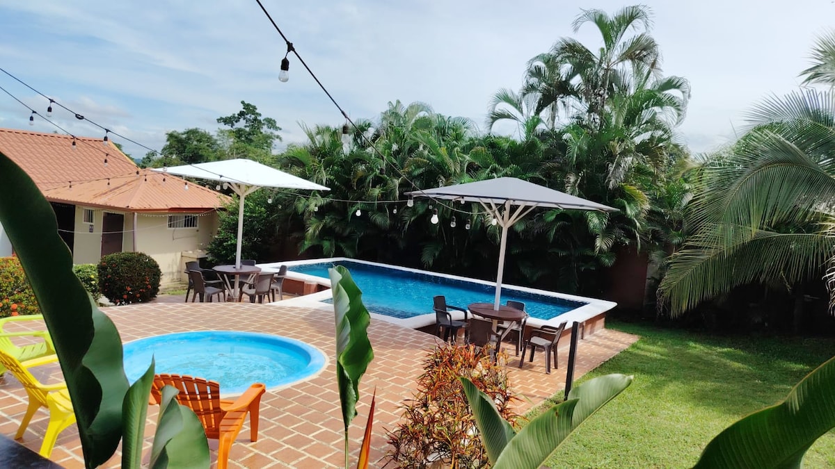 Hermosa casa en 5000 m², con 4 habitaciones (baño privado y aire acondicionado), cocina amplia, sala de estar y espectacular terraza. Disfruta de la piscina y acceso a un río cercano. Ideal para familias y amigos en busca de relajación y naturaleza. Beautiful house on 5,000 m², featuring 4 bedrooms (each with private bath and air conditioning), spacious kitchen, living room, and an amazing terrace. Enjoy the pool and access to a nearby river. Perfect for families and friends seeking nature.