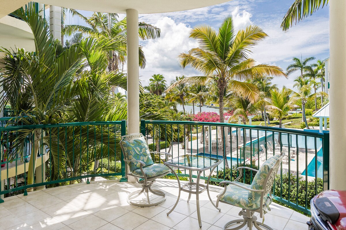 Welcome to our private island paradise. This is a light, charming, one bedroom unit in a quiet setting with a view over the terraced pools & into Turtle Cove & the marina. Its 1091 square feet bring a spacious open plan living/dining/kitchen/balcony. The patio door opening spans 16 ft. The large bedroom has a king bed, walk-in closet, another TV & beautiful ensuite bath w/ large shower. Please note, elevator is currently under repair.