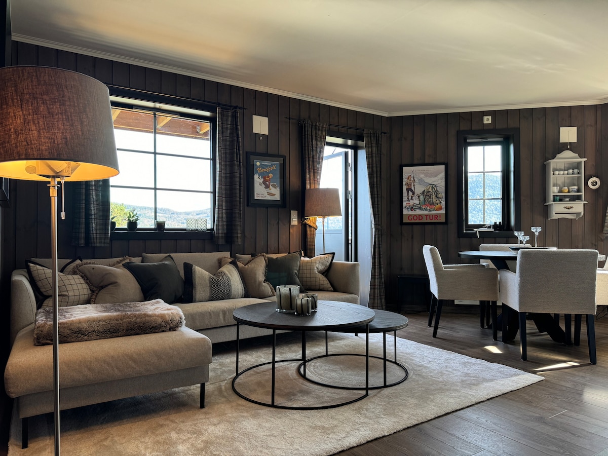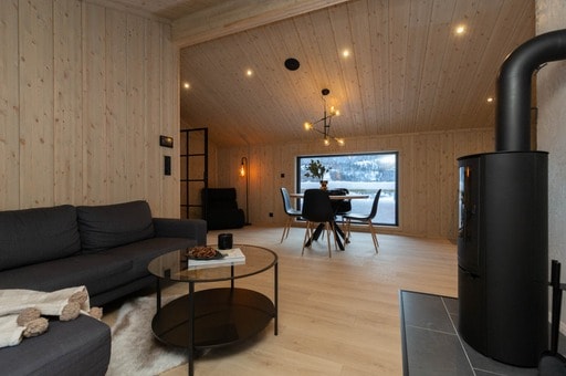 Newly built mountain lodge (2022) in massive wood. The apartment is inviting and cosy, with interior in Scandinavian style. You will find all the comfort and equipment you need to relax & enjoy delicious food and company after an active day! Have your morning coffee outside in the sun, overlooking the mountain tops. Light a fire, enjoy the views from the sofa & makes use of our books or boardgames. Maybe you prefer watching a movie on The Frame? Have a good night sleep in the fresh air!