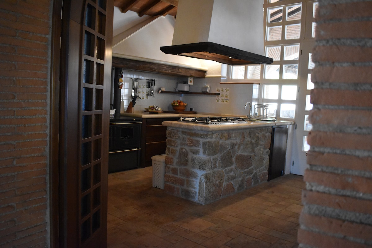 Villa in pietra con particolari rifiniture architettoniche immersa in un bosco di castagni. Un grande giardino, in parte pavimentato a pietra, correda la proprietà dal quale si può ammirare un panorama meraviglioso della maremma toscana. Immersi nella natura si nota da una parte il mare con il golfo di Follonica, l'isola d'Elba e la Corsica, dall'altra l'isola del Giglio. E' possibile fare lunghe passeggiate nella natura o raggiungere località balneari o città d'arte.