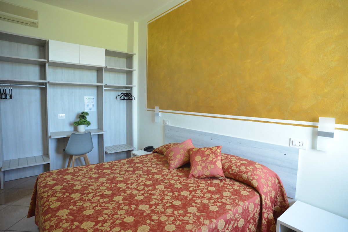 Camera doppia nella nuova "La Stenella", realizzata nel 2019, con una metratura che varia dai 12m2 ai 15m2, per due persone, dotata di climatizzatore indipendente, tenda oscurante, arredamento funzionale, tv Led, cassaforte elettronica, piccolo frigo, bagno con doccia e internet wi-fi. Non è presente il balcone. Distanza dal corpo centrale 50 metri.