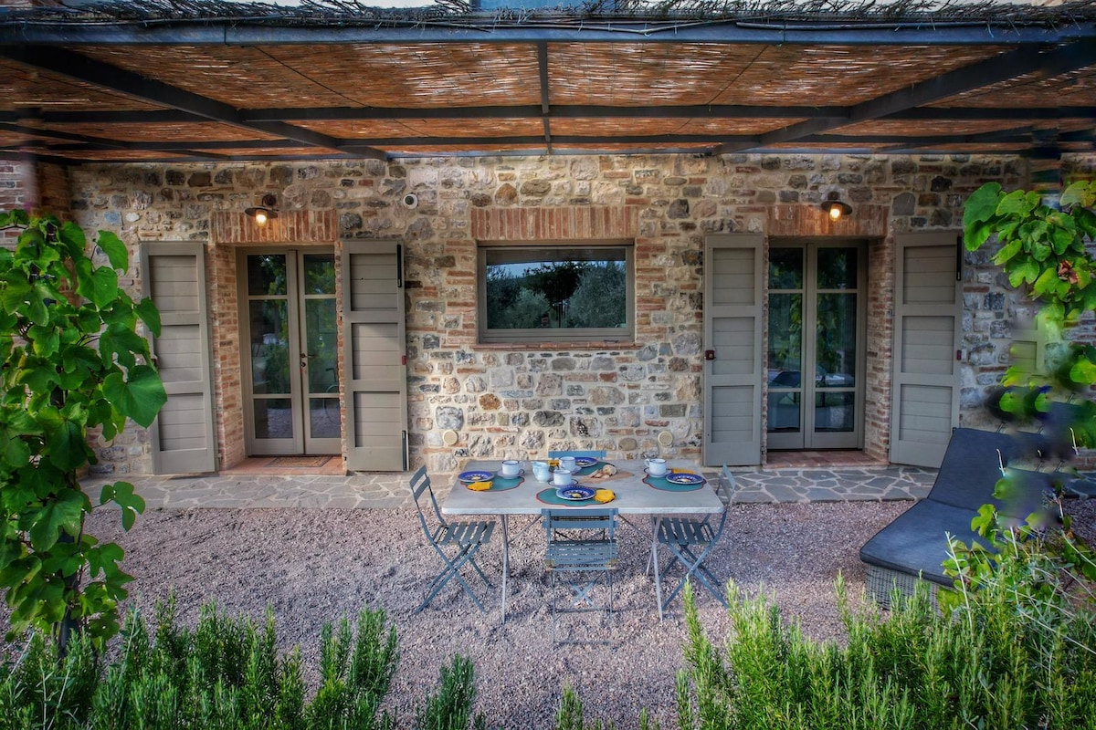 ✅ 45 m² on ground floor with kitchen ,1 double bedroom ,1 bedroom with 2 twin beds both with airco, 1 bathroom. Large patio with shade ideal for morning coffee and all your meals. ✅ Panoramic pool, ideal for relaxtion and family fun ✅ 1 km easy walking to the medieval town with cobblestone streets and delightful details at every corner ✅ Central location to visit hidden gems + many Unesco Heritage Sites Leccio Cottage is part of Monti 1824 farm,composed of 6 accommodations + pool