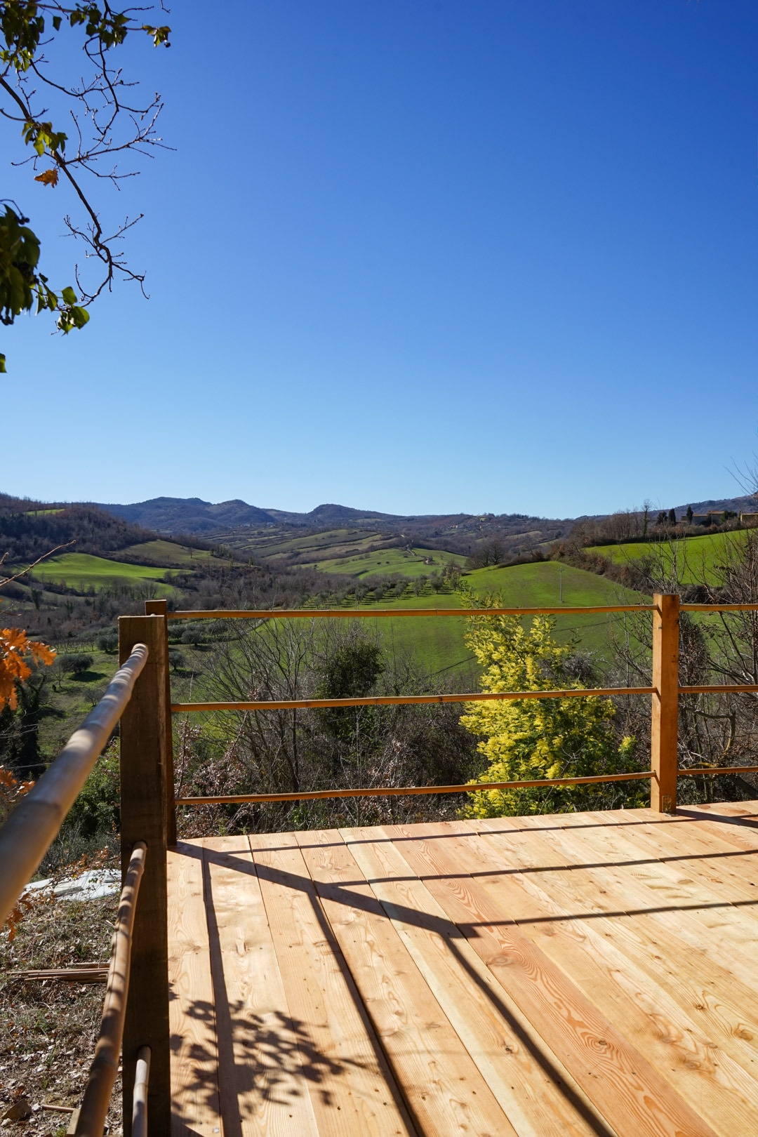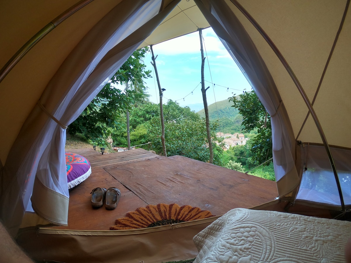 Under ancient trees in a wonderful landscape, there is a big cotton tent placed on a large wooden terrace, with a breathtaking view. The tent has a diameter of 5 meters and is equipped with a bed for 2 persons, 2 single beds (if needed), carpets on the floor, electricity and water. The tent is guaranteed to be waterproof and the thickness of the canvas offers sufficient protection against the wind. In front of the tent there is a large terrace with a table, chairs and deckchairs.