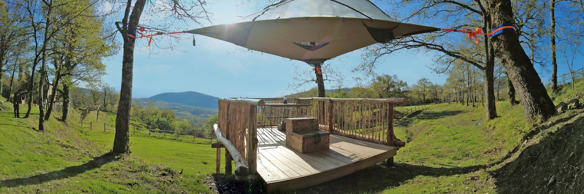 Tenda “Altana” offre un esperienza di tenda sospesa comoda e spaziosa con una incredibile vista sulla Valle del Sovara. Un esperienza unica di campeggio, a cavallo tra l'agricampeggio e il moderno Glamping. Sospesi nella natura, dormendo sotto le stelle, in totale sicurezza grazie alla garanzia delle tende Tentsile. Ogni tenda è attrezzata con tutto il necessario per il campeggio, basta portare il proprio sacco a pelo e sarete pronti per la vostra esperienza sospesi tra gli alberi di Mafuccio.