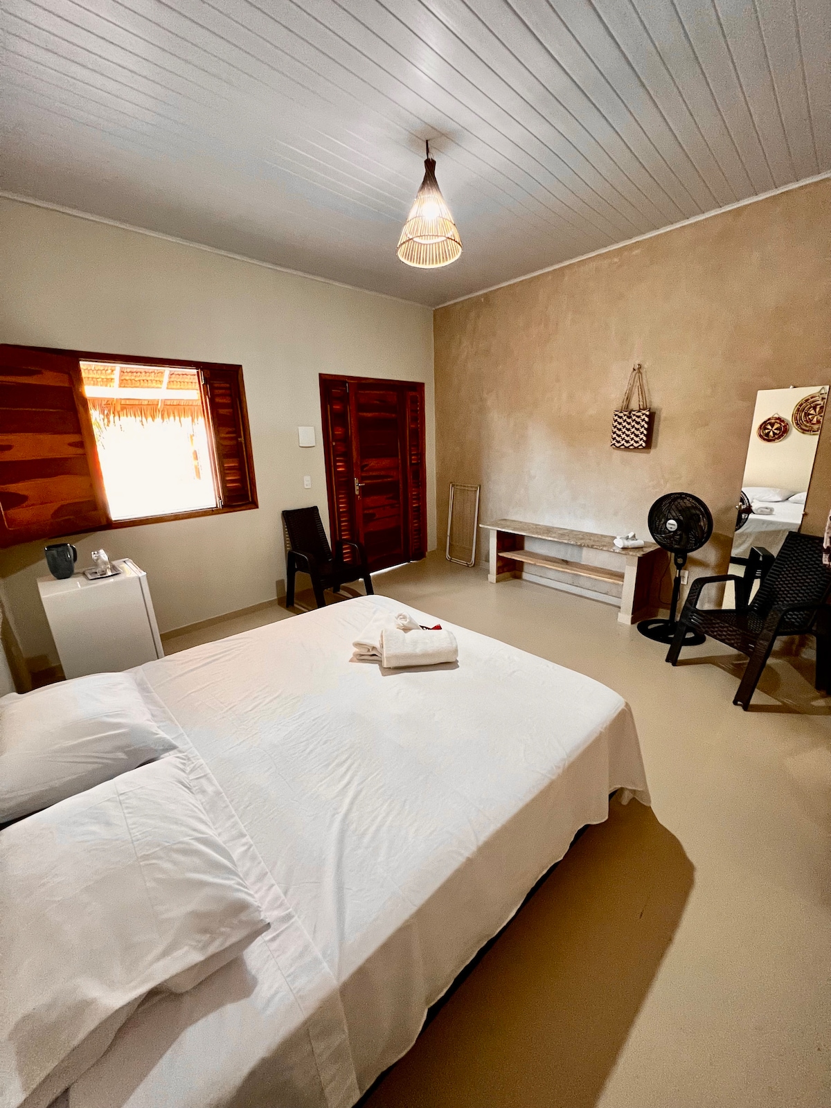 A suíte oferece conforto com um banheiro privado equipado com chuveiro elétrico, frigobar, e ar condicionado. Além disso, há uma rede disponível tanto na varanda quanto dentro do quarto, proporcionando um espaço relaxante.