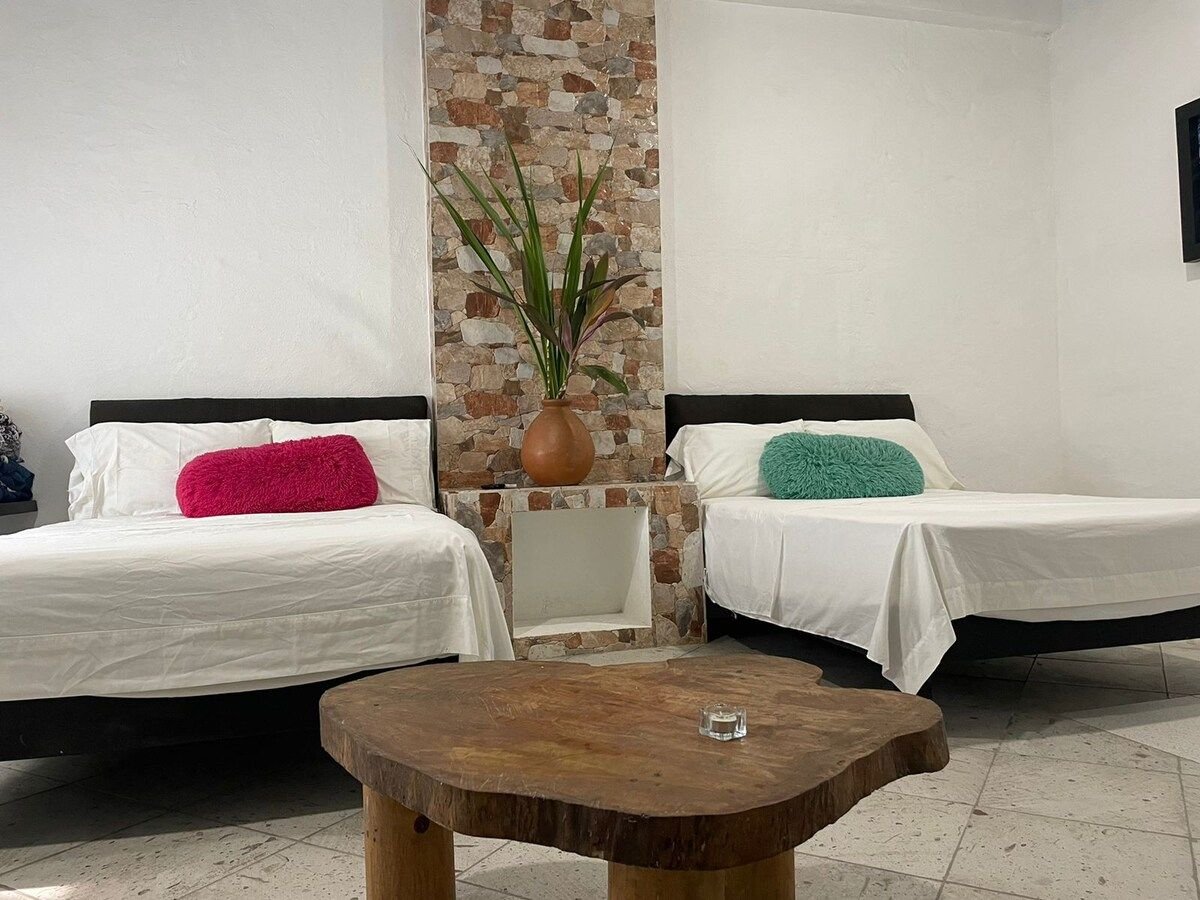 Relájate en este espacio tan tranquilo y elegante ideal para familias contemporáneas, donde podrás sentirte en casa por sus detalles y la tranquilidad de la zona. A solo 3 min en carro de la playa, este departamento ofrece 2 recámaras con camas matrimoniales y aire acondicionado, un colchón inflable opcional, baño completo, sala con Smart TV, internet de alta velocidad, cocina equipada, patio con palapas y jardín, y estacionamiento privado para un carro (con opción a dos). ¡Te esperamos! :)