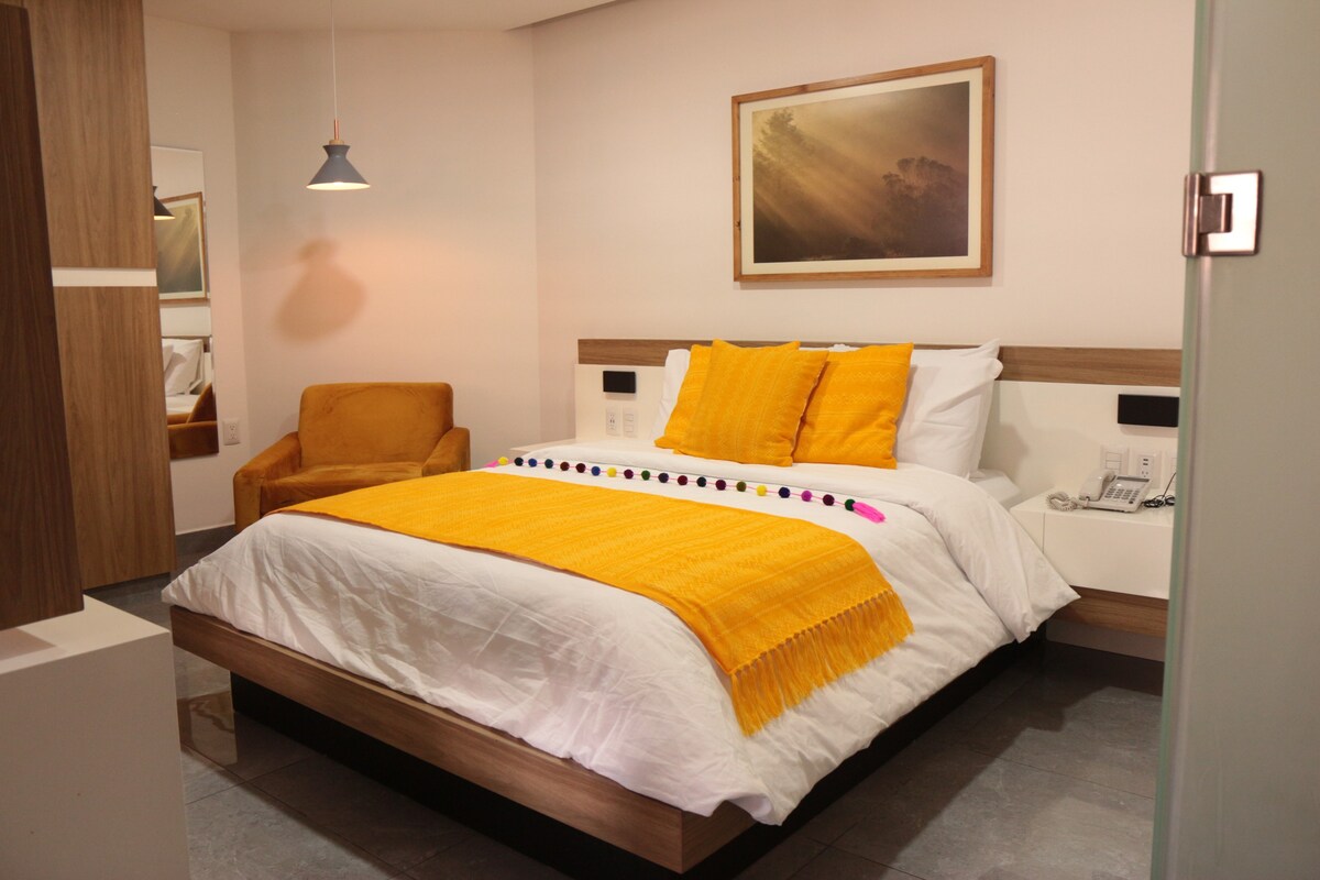 Una habitación muy confortable con iluminación indirecta, colchón matrimonial Memory Form, Cerraduras digitales con códigos de acceso personalizados, cuenta con área de vestidor, ubicada frente al Parque de la Marimba, zona muy céntrica de la Ciudad de Tuxtla Gutiérrez, con tiendas de autoservicio, supermecados y paradas de transporte público muy cerca. Cerca de Museo de la Marimba, Parque Central y Parque Bicentenario. A pocos minutos de plazas comerciales.