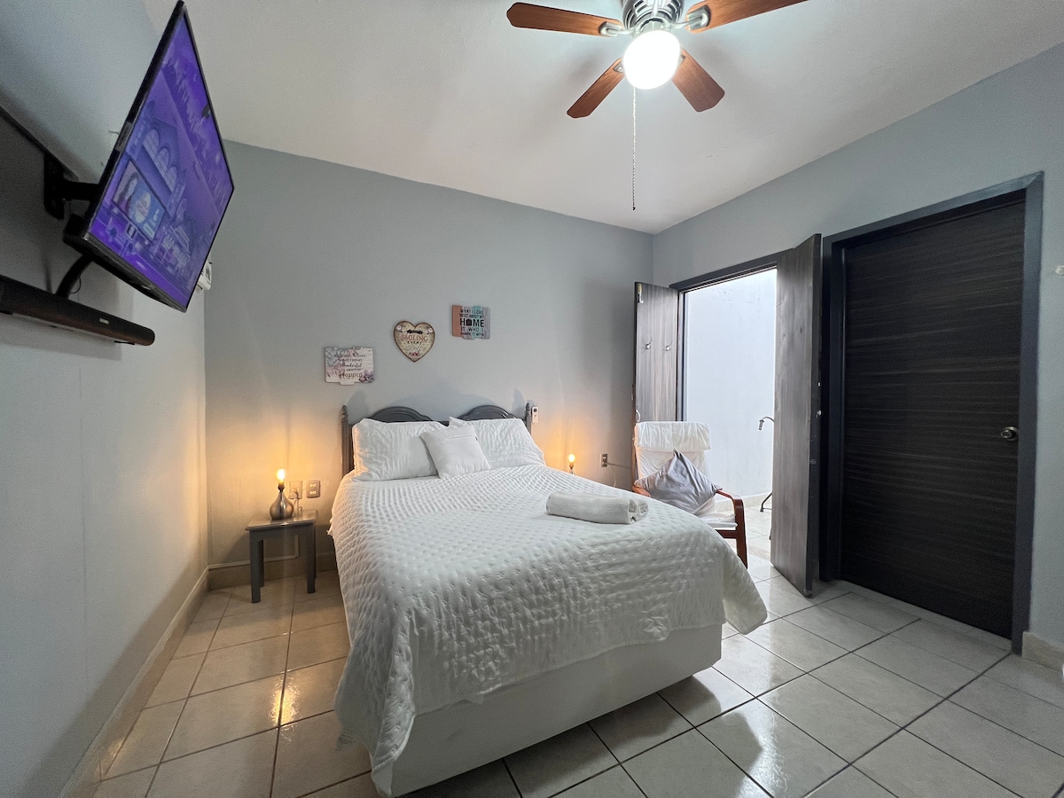 Relájate en esta escapada única y tranquila. En nuestra suit disfrutarás de una estancia cómoda y agradable, diseñada con esmero para ti. Podrás descansar en un espacio fresco con aire acondicionado, agua caliente en la regadera, área de trabajo, espacio de lectura, televisión con netflix, gozando del beneficio de una entrada independiente con estacionamiento privado. Te sentirás segura acompañada de nuestra familia en la casa principal y con vigilancia las 24 horas.