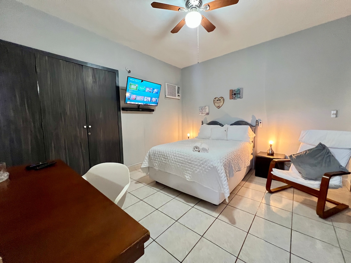 Disfruta de una habitación privada, fresca y cómoda, con entrada independiente dentro de un entorno familiar y muy tranquilo. Perfecta para viajeros que buscan privacidad sin aislarse: tendrás tu propio espacio, pero con la tranquilidad de saber que la anfitriona se encuentra a pocos metros, siempre disponible si la necesitas. Cuenta con ac, TV, clóset y baño privado con agua caliente. Además incluye frigobar, microondas y cafetera, para que puedas disfrutar algo rico sin salir.