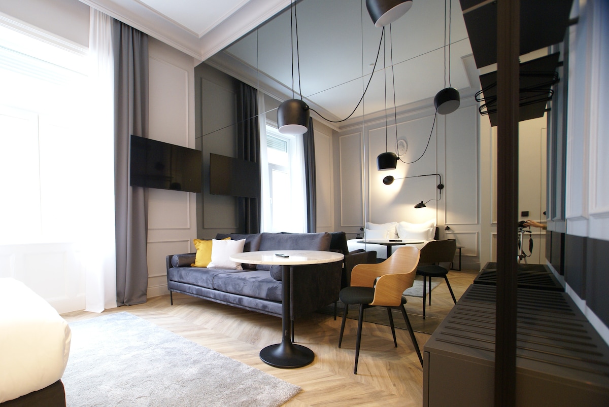 BRAND new elegant apartment in the CITY CENTER less then 10 min walking distance from the main square and train station. Situated in a peaceful backyard on the main street so you can enjoy quiet nights. There is one bedroom with queen size bed, living room with TV + NETFLIX and pull out sofa (queen size), bathroom with toilette and spacious walk in shower separated. All furniture and appliances are brand new. FREE tea&coffee,FREE towels.