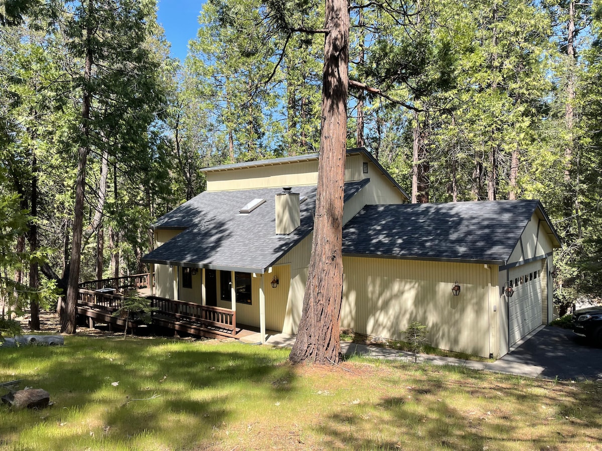 Stunning private mountain home in a lake community with all the modern amenities. This 2 story home boasts 2,200 sq. ft., 3 bdrm, 3 bath, 2 living rooms, and a large deck. The home features central heat & air, open kitchen/living concept with large island to gather around, along with wifi and smart TVs. This home is beautifully furnished and decorated with a vintage touch. Just a few minutes from the lake or golf course, and about 45 mins to the Yosemite gate.