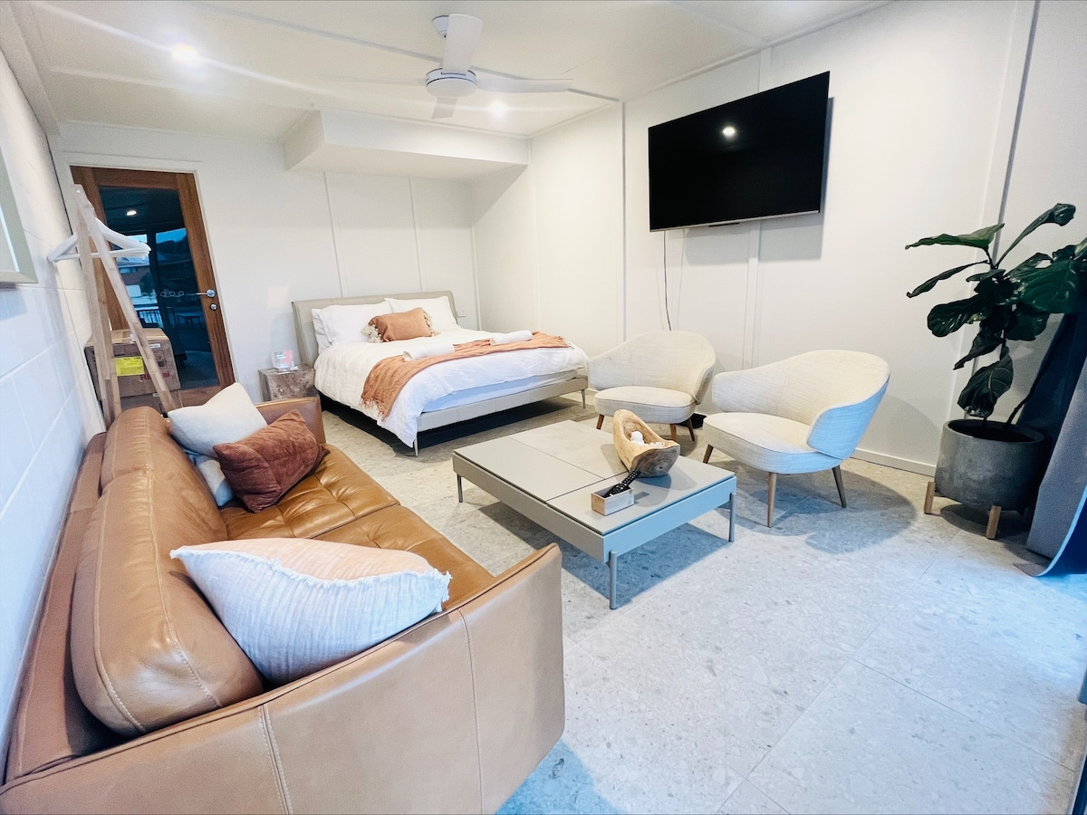 Nestled in the heart of Currumbin Valley, the Acute Abode invites you to leave the world at the door and immerse yourself in complete tranquility. Our cozy Abode is waiting for you with plenty of places to curl up with a book in our indulgent loft queen bed that peers over the living area and out to nature through our colossal windows. Pour yourself a wine, gather around the fire, and surrender to serenity at the Acute Abode. follow us @_acuteabode_