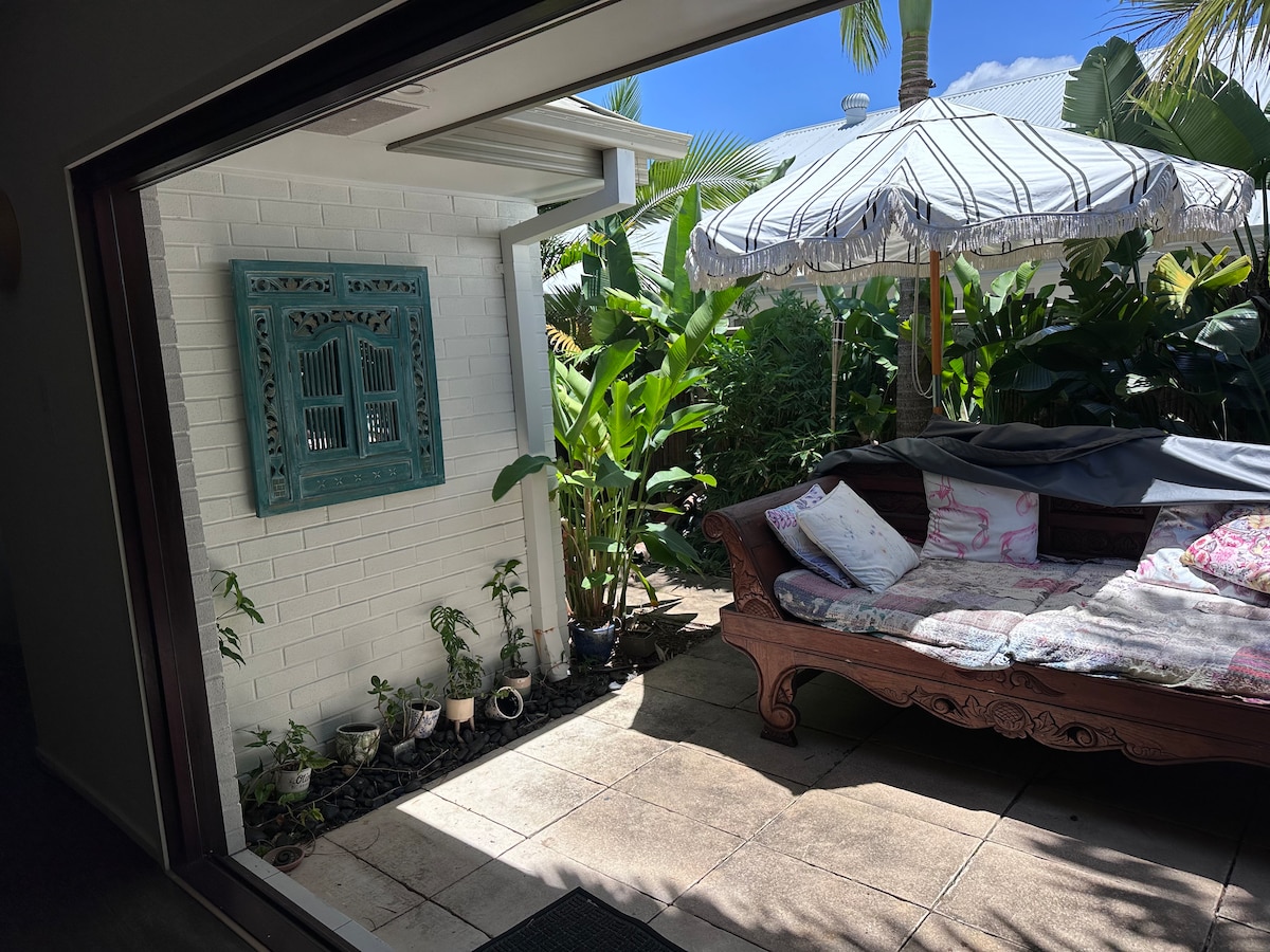 Air Conditioned Coastal Styled Beach Studio, 100 mtrs to Kingscliff Beach, parklands/bike tracks. Nestled under one of our beautiful Frangipani trees on Kingscliff Lane, our studio is set away from the main house, has a separate entrance & enjoys a quiet, private location. It is spotlessly clean & beautifully appointed with WiFi, smart TV, comfy beds and the highest quality linen. Guests have the use of the breezeway alfresco dining/BBQ area, table tennis table & several outdoor relaxation areas