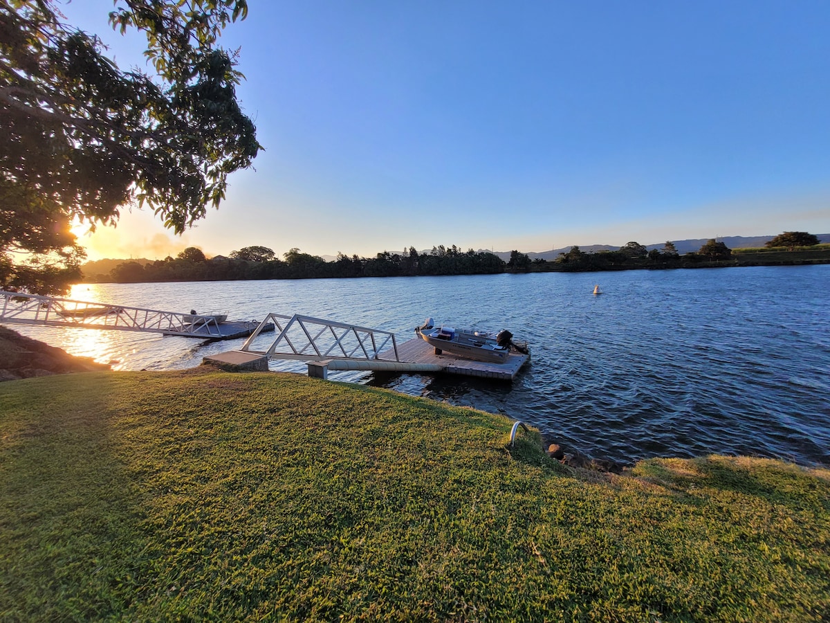 Spacious, private and comfortable top floor apartment with exclusive entrance through own enclosed Franjipani gardens. Generous light-filled living areas and breezy balconies. Extra large master and queen bedrooms with treetop views. Quiet location opposite nature reserve. Outdoor bbq/ daybed/ dining/ firepit in beautiful secret garden. 2 minute walk to river in Bruns. Walk to beach, cafes, restaurants, bars, pub, shops, markets and enjoy the simple pleasures of our special riverside village