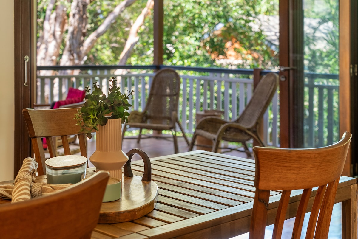 Your private studio with attached bathroom and large deck in this unique home has a stunning outlook over the crystal clear creek with ocean glimpses through the trees. Spacious and light filled. Relax sitting out on the deck watching the sun and moon rise over the water. Stroll down to the creek for a dip or along the boardwalk to the patrolled beach and cafes. @hightidestays
