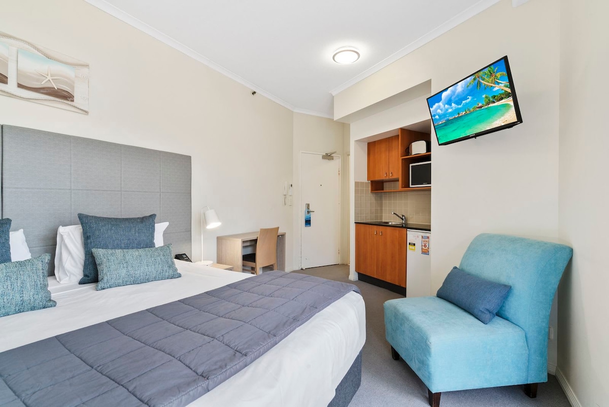 Oaks Gold Coast Calypso Plaza Suites is a premium, family-friendly Coolangatta hotel just minutes from Gold Coast Airport and situated opposite beautiful Coolangatta Beach, the 4.5-star resort features a huge swimming pool, water slides, gymnasium, outdoor spa, Sauna and direct access to the foreshore of Coolangatta beach. Our apartment is a 1 bedroom with a kitchen and living dining area and its own balcony.