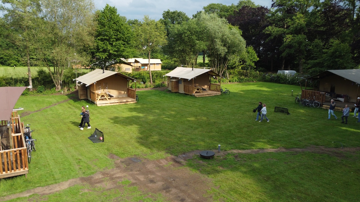 Een sfeervolle, volledig ingerichte tent naast de landerijen op camping Zwolsedijk tussen Hasselt en Zwolle. De tent (2-3 personen) staat naast de dijk waar tegenover de rivier het Zwartewater en Vecht stroomt. Bij de tent zit een Canadese kano en 2 fietsen inbegrepen om de omgeving te verkennen. Er is een mini pizzaoven, driepoot vuurkorf, dutch oven pan, hangmat, boxspring, 2 slaapbank, mini koelkast en verwarming, kookplaat, houtkachel en kleine bbq aanwezig voor een unieke outdoorbeleving.