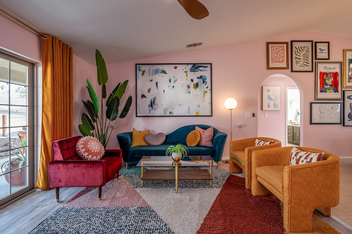 Welcome to Sunset Sage ~ an inspired desert retreat personally designed, built, and styled by a true artist. Every detail, from the layout to the artwork, reflects a labor of love and creative vision. Soak under the stars in the hot tub, cozy up by the fire pit, or curl up with a book in a hammock. Whether you're stargazing with friends or enjoying quiet moments alone, Sunset Sage was made to inspire. Play a round of pool, sip something cold in the sun, and create lasting desert memories.
