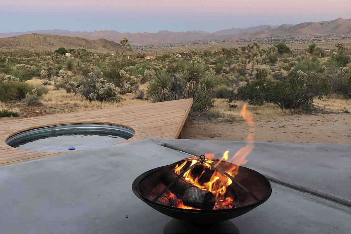 Wake up to panoramic desert skies just 10 minutes from Joshua Tree National Park. This stylish 1-bedroom retreat is perfect for couples, remote workers, and stargazers, with a private hot tub, cozy fire pit, and blazing-fast WiFi. Spend your days exploring the park, return to relax in the hammock, soak under the stars, or gather around the fire. In the morning, enjoy a fully equipped kitchen and have breakfast under the pergola at the knotty wood dining table. Large fenced yard ideal for pets.