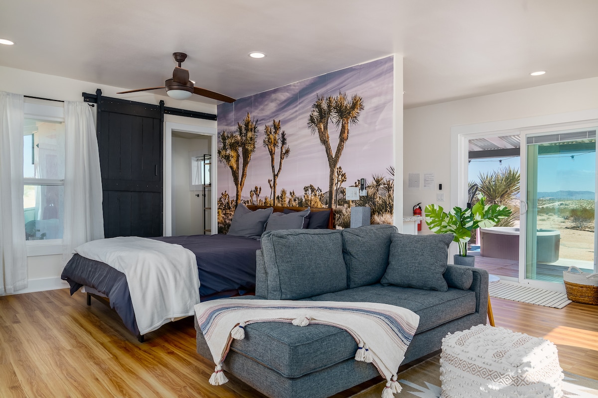 Less than a mile from Joshua Tree National Park, Tasi 29 is a modern desert hideaway on 5 acres, next to vast open desert & mountains. You’ll melt into the unique feeling of silent open space. Once a simple 1955 ‘homestead’ block house, this renovated and designer decorated, rancho style home has been reimagined to let the desert views pour in. Watch the show from the covered patio, salt water pool or in the giant jacuzzi as the incredible desert sunsets give way to a surreal canopy of stars.