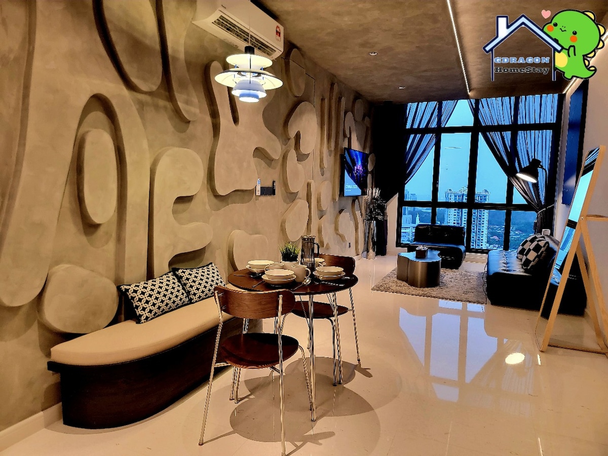 Experience the epitome of industrial chic in our spacious studio unit, boasting premium queen-size beds that ensure a restful night's sleep, all while enjoying breathtaking sea views of JB city. Entertainment options abound with a Smart TV equipped with YouTube and Netflix apps, perfect for unwinding after a day of exploration. Conveniently located near shopping malls, - 5-minute drive to KSL City Mall - complimentary shuttle bus service to CIQ. - Shuttle bus services to KSL & Mid Valley