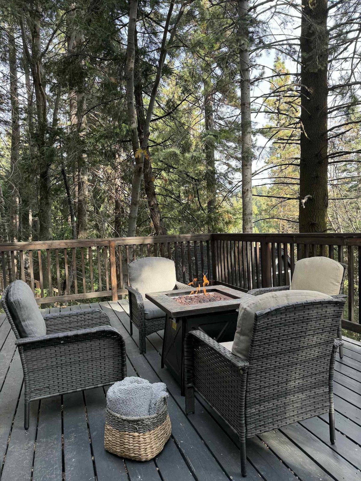 Escape to the mountains and cozy up at The Acorn Cottage, a tiny oasis located near beautiful Lake Arrowhead. Featuring breakfast seating, living room for watching TV or playing games, one full-bath, a roomy bedroom upstairs, a gas fire pit and bbq on the deck with comfy seating and dining. This is the perfect little getaway! Sit outside in the morning with your cup of coffee on our beautiful patio and sit by the fireplace at night with a glass of wine or cup of tea after your daily activities.