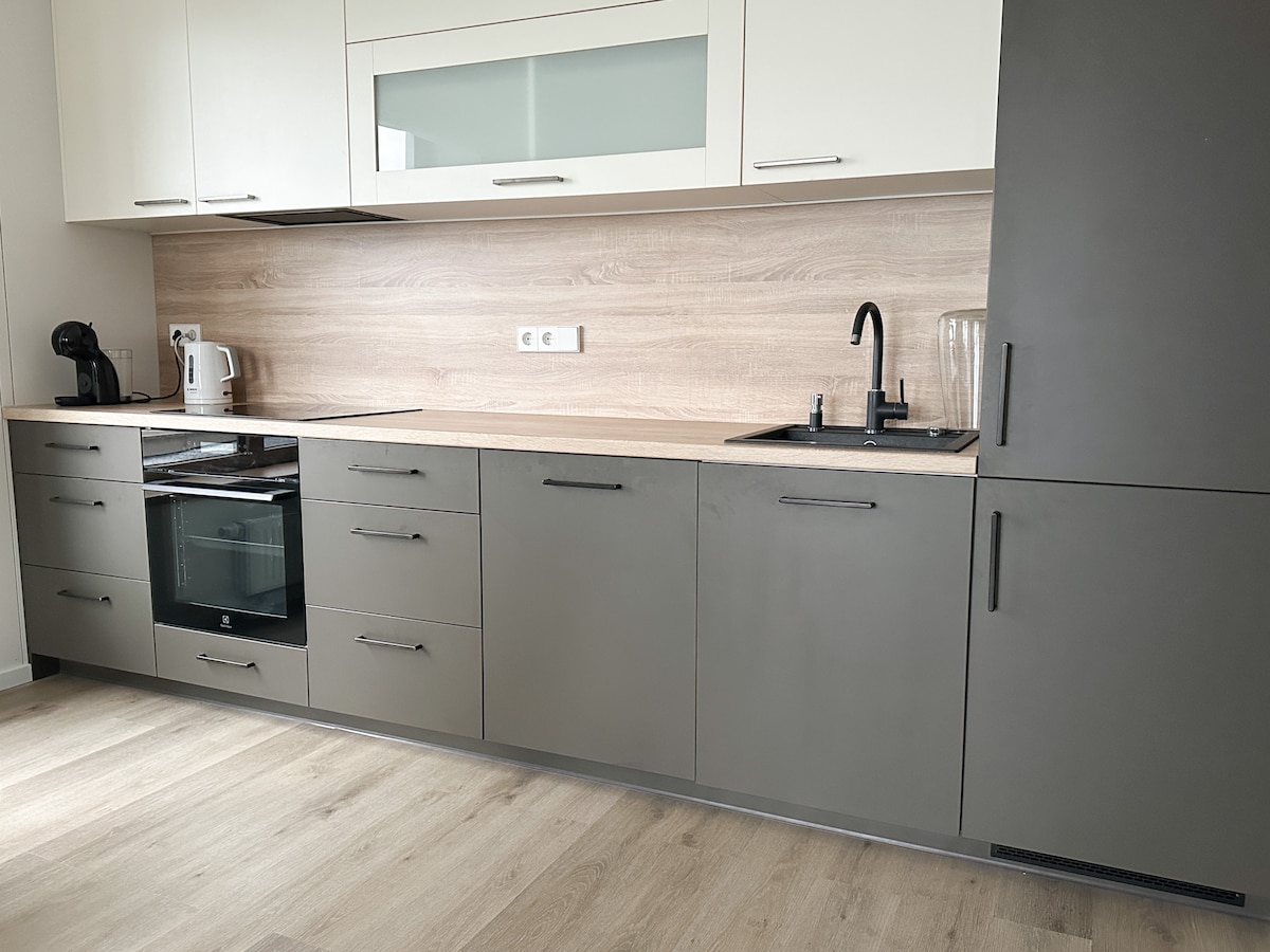 Apartment is located in newly developed area ( Vilnius Business Center), close to the old town. It's 9 mins to Japanese garden, 25 mins walk to the old town, 10 mins walk to EUROPA mall. Apartment decorated in Scandinavian style - cozy, light and modern. It's 49 sq/m, has separate bedroom, living room with the kitchen, balcony. Great for staying up to 3 people - from leisure to work or longer stays ! Parking is street parking, paid 1€/1h during Monday to Saturday ( 8.00 - 20.00 )