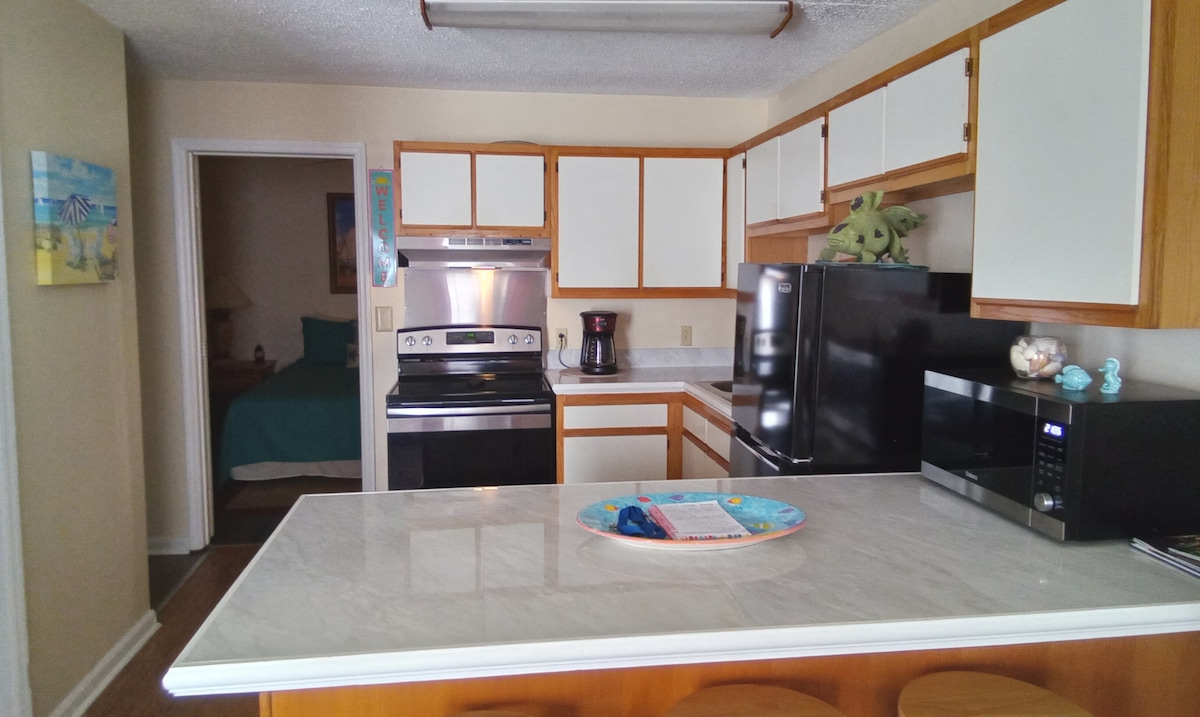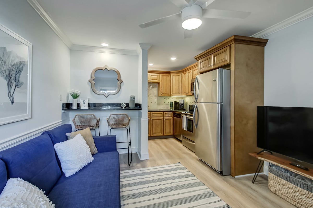 Enjoy a stylish experience at this centrally-located condo. Surrounded by all the island fun from locally-owned restaurants and super cute shops . A quick 2 minute walk to the beach or pier. Our home includes everything you could need to enjoy your stay. Now, with a fully stocked kitchen, including a blender and crock pot. Bed rooms come with luxurious memory foam mattresses, and the living room has a pullout bed. Come unwind and enjoy your time.