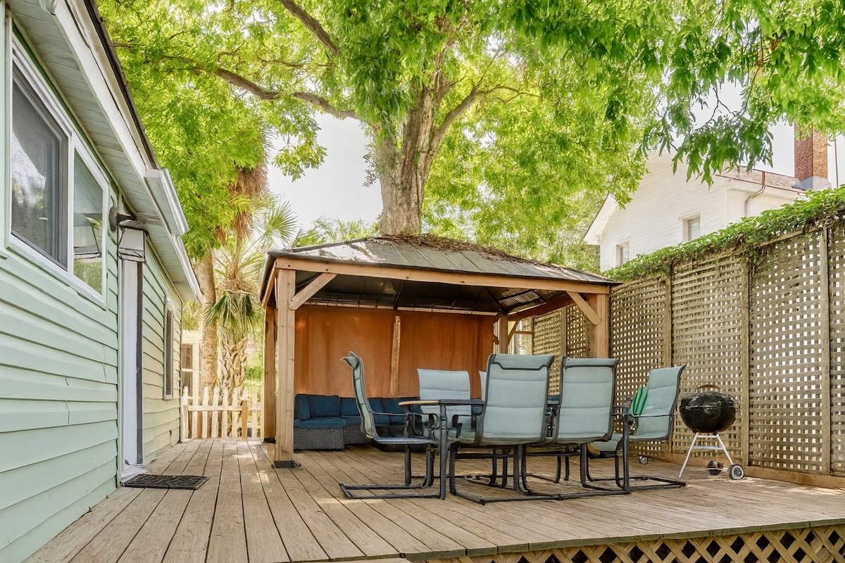 Steps from the beach, Tybee's lighthouse, Marine Science Center & Lvl 3 EV charger 🎉 This popular, historic cottage is located in the heart of north Tybee. Built in the early 1900s by the army, this charming 3BR - 2BA house is full of character & perfect for a couple or large family. Dog-friendly-NO pet fee. Fenced in back yard & deck w/ outdoor sofa, canopy, dining table. Full kitchen & laundry. WiFi, Directv & free parking. Most essentials provided. Easy self-check-in and check-out.