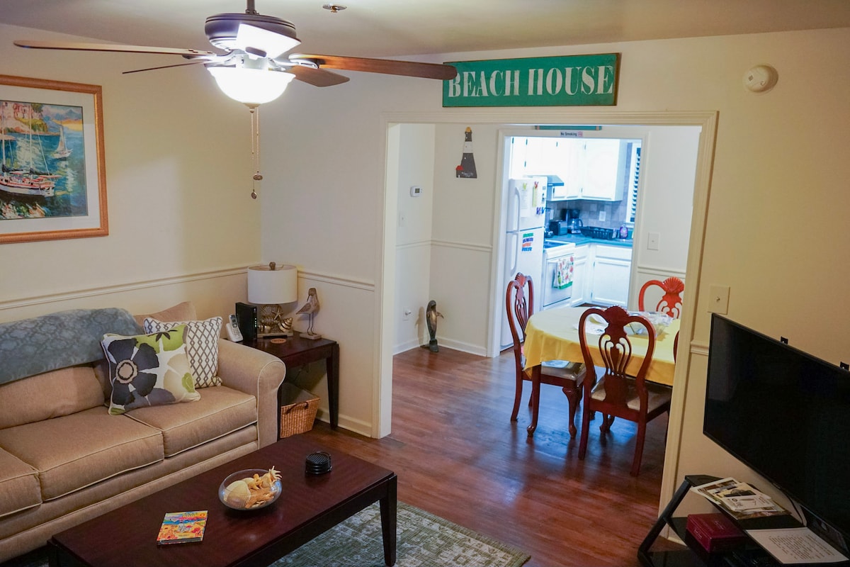 LOCATION, LOCATION, LOCATION!! This efficiency studio-apartment is just right for two people. For your convenience and comfort the apartment has a new Queen size bed, private entrance, fully stocked kitchen, and private bathroom. There is a large shared covered deck, great for relaxing and chatting with other guests. All units have wifi and 50 inch ROKU. Bring your log ins. No discounts on Internet outages I cannot control that.